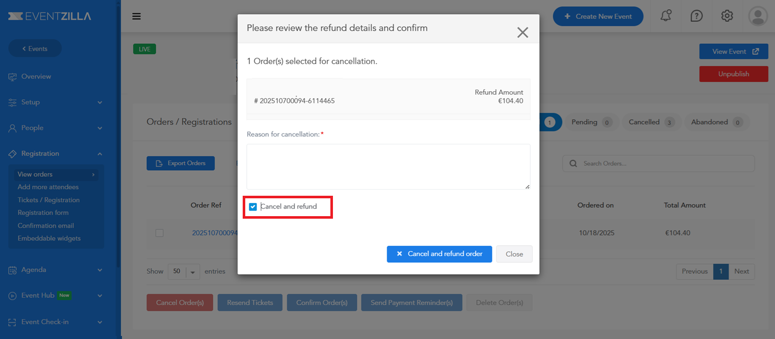 Event organizers can cancel an order without automatically processing a refund. This option provides greater flexibility when managing registrations, especially in cases where a refund is not required or will be handled separately outside the platform.